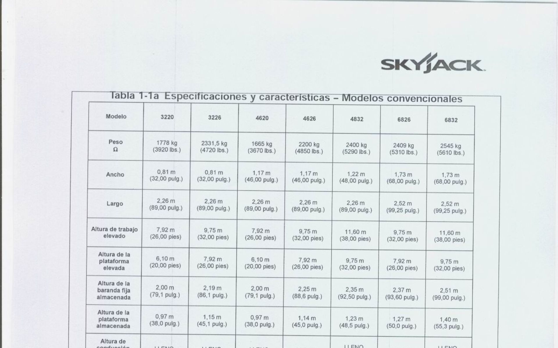 Altura de trabajo: 11,60 MetrosAnchura total: 1,22 MetrosLongitud total: 2,26 metrosPeso: 2400 KG